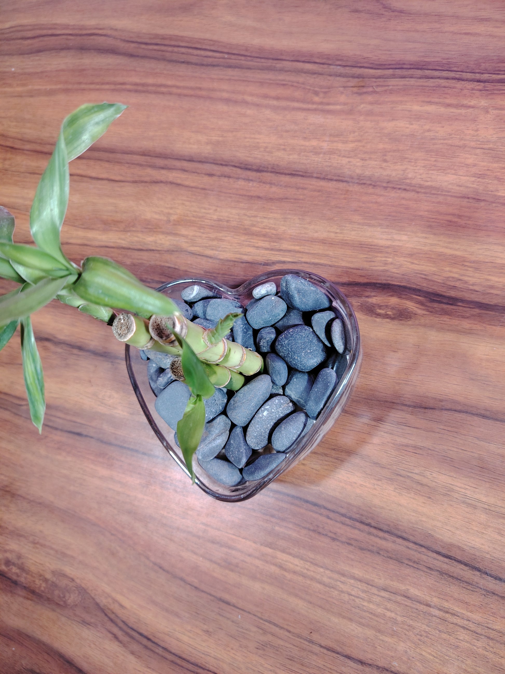 Bambu de la suerte ideal para interior rectos en base de vidrio grueso en forma de corazón con piedras y en agua.